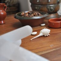 Utilização de roupa terapêutica ayurvédica. A sua actuação não se restringe à cromoterapia, mas estende-se à aromaterapia e também às influências bioquímicas e subtis dos têxteis biológicos certificados e das plantas ayurvédicas seleccionadas para tingir os tecidos. Teremos uma écharpe à sua espera durante a recepção ao participante.